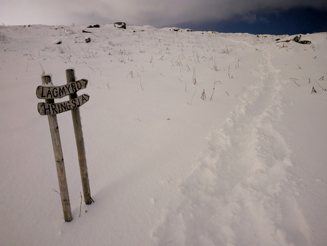 Civilization up on the the hill, and the snow-mobile tracks made a reappearance, which was good since the tracks went where I was going.
