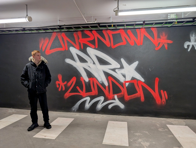 An ad for a local clothing label in the parking garage. Bjarki tried to look cool.