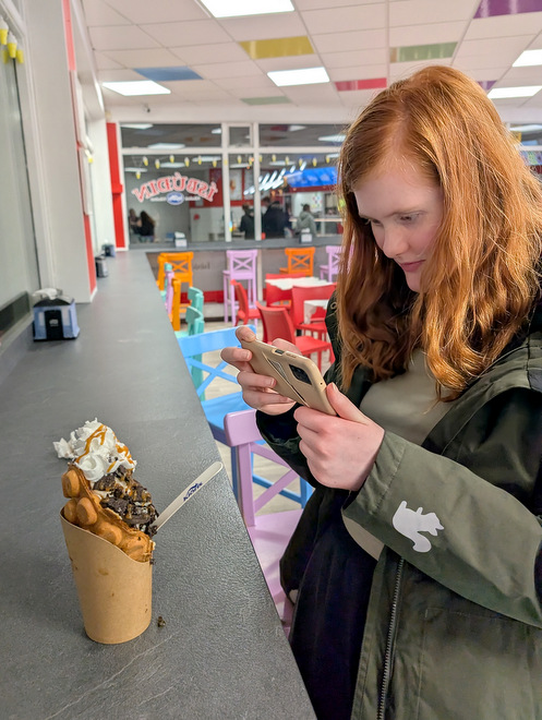 Photographing her monstrosity of a waffle plus ice-cream plus candy plus oreos.