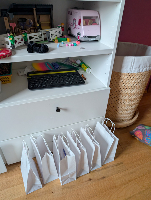 Emma prepped goodie bags for a few class-mates she had invited over for her birthday.