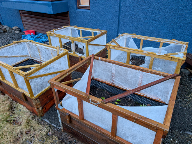 The sorry state of the veggie boxes after a winter of wind and snow and rain.