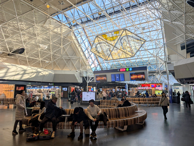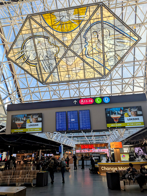 It’s easy to ignore the big glass art in the ceiling, but it’s been there ever since the airport opened some decades ago (in 1987).