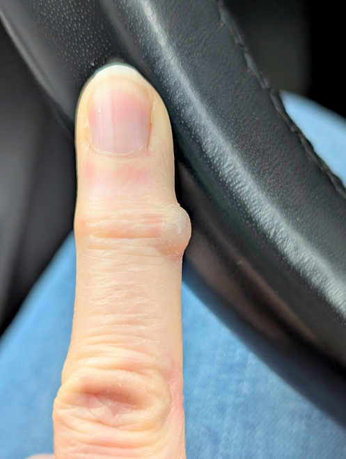 Sorry for no photo-warning, but my poor right pinky had sprung a joint-leak, much to my annoyance. The joint was apparently leaking joint-gel, making a “ganglion cyst” that I kept banging into things, which was darned painful.