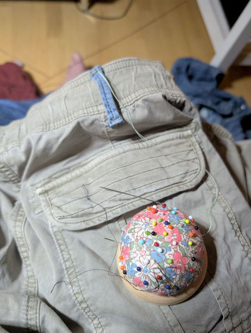 Adding belt-loops from decommissioned pants to pants Emma wanted to use the following day, for her Ash Wednesday costume.