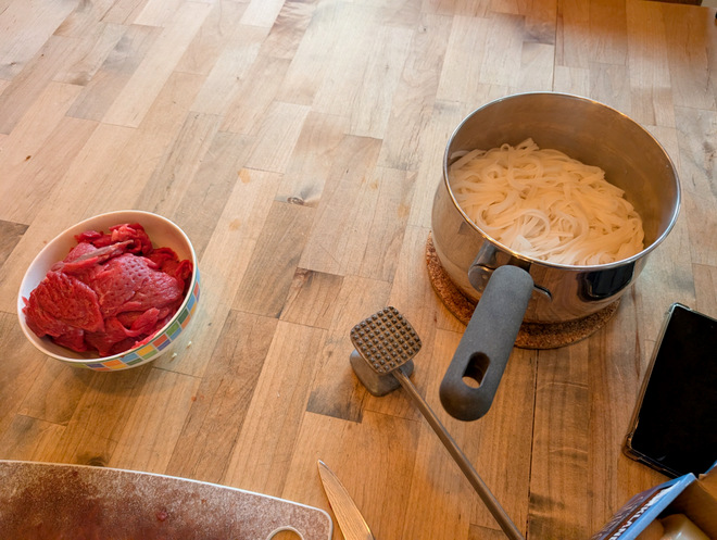 Noodles and beaten beef.