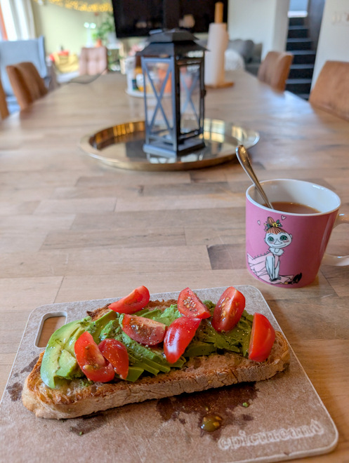 My own avocado and tomato toast at home, for once. Sadly had no hummus to put on the bread as a base.